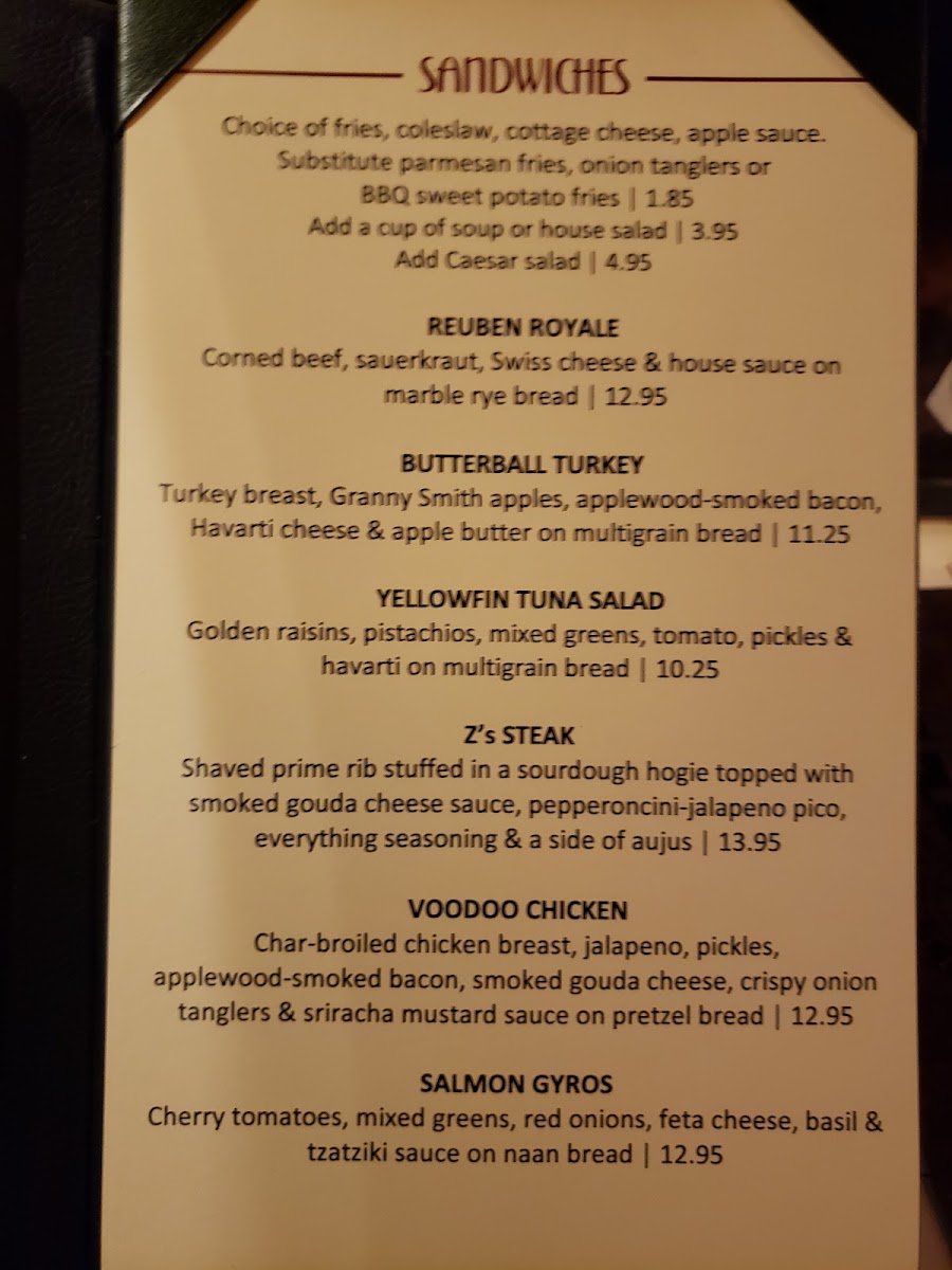 Welcome to Zeppelins, a vibrant gem nestled in Cedar Rapids, IA, where culinary creativity meets warm hospitality. The menu is a delightful array of offerings designed to tantalize your taste buds. Begin your culinary adventure with the Big Bowl of Brussels, featuring crispy sprouts paired with roasted garlic, apples, and a bourbon maple mustard vinaigrette, priced at US$14.65. For a savory bite, indulge in the Cheese Wontons or the zesty Smoked Wings, available in unique sauces like Hindenburg and raspberry BBQ. As for sandwiches, the Rueben Royale and Butterball Turkey boast exceptional flavor profiles that impress even the most discerning palates.